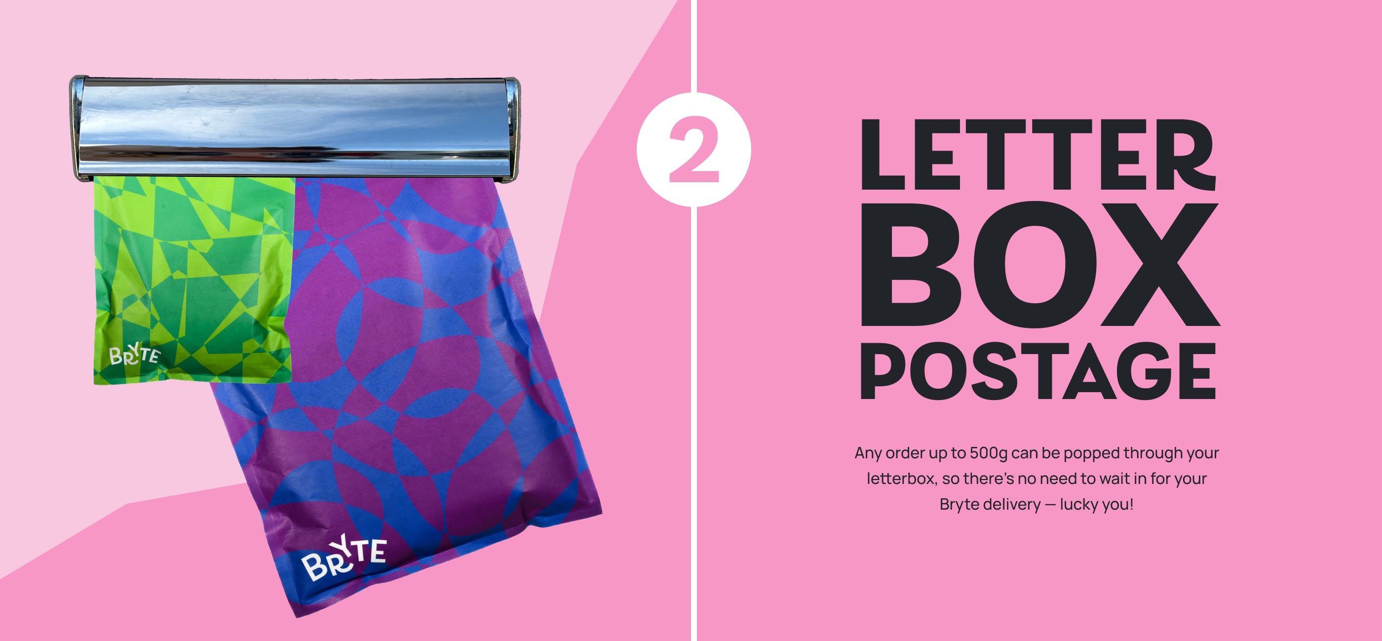 2. Letter Box Postage. Any order up to 500g can be popped through your letterbox, so there’s no need to wait in for your Bryte delivery — lucky you!