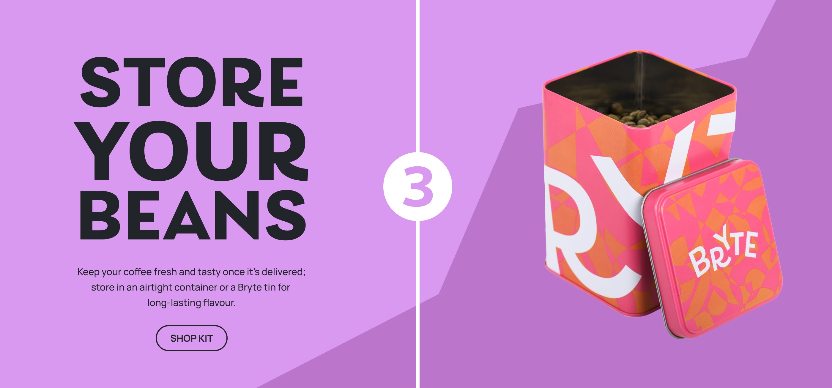 3. Store your beans. Keep your coffee fresh and tasty once it’s delivered; store in an airtight container or a Bryte tin for long-lasting flavour.