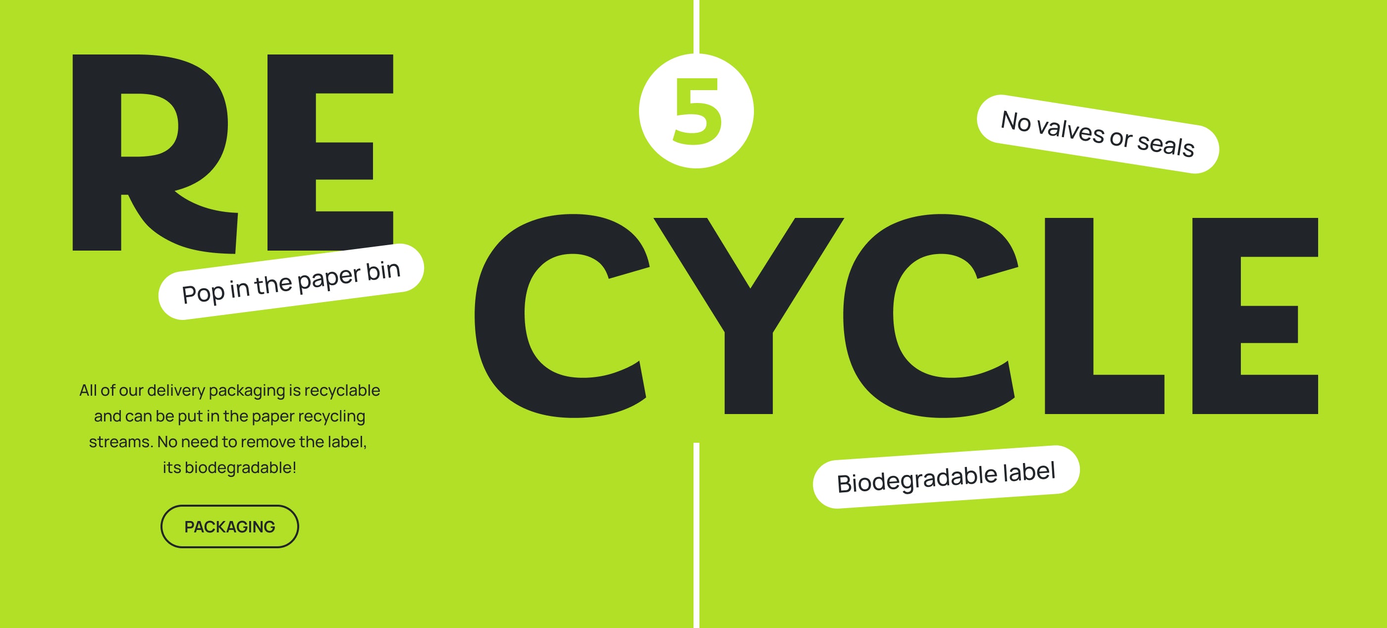 5. Recycle No valves or seals. All of our delivery packaging is recyclable and can be put in the paper recycling streams. No need to remove the label, its biodegradable!