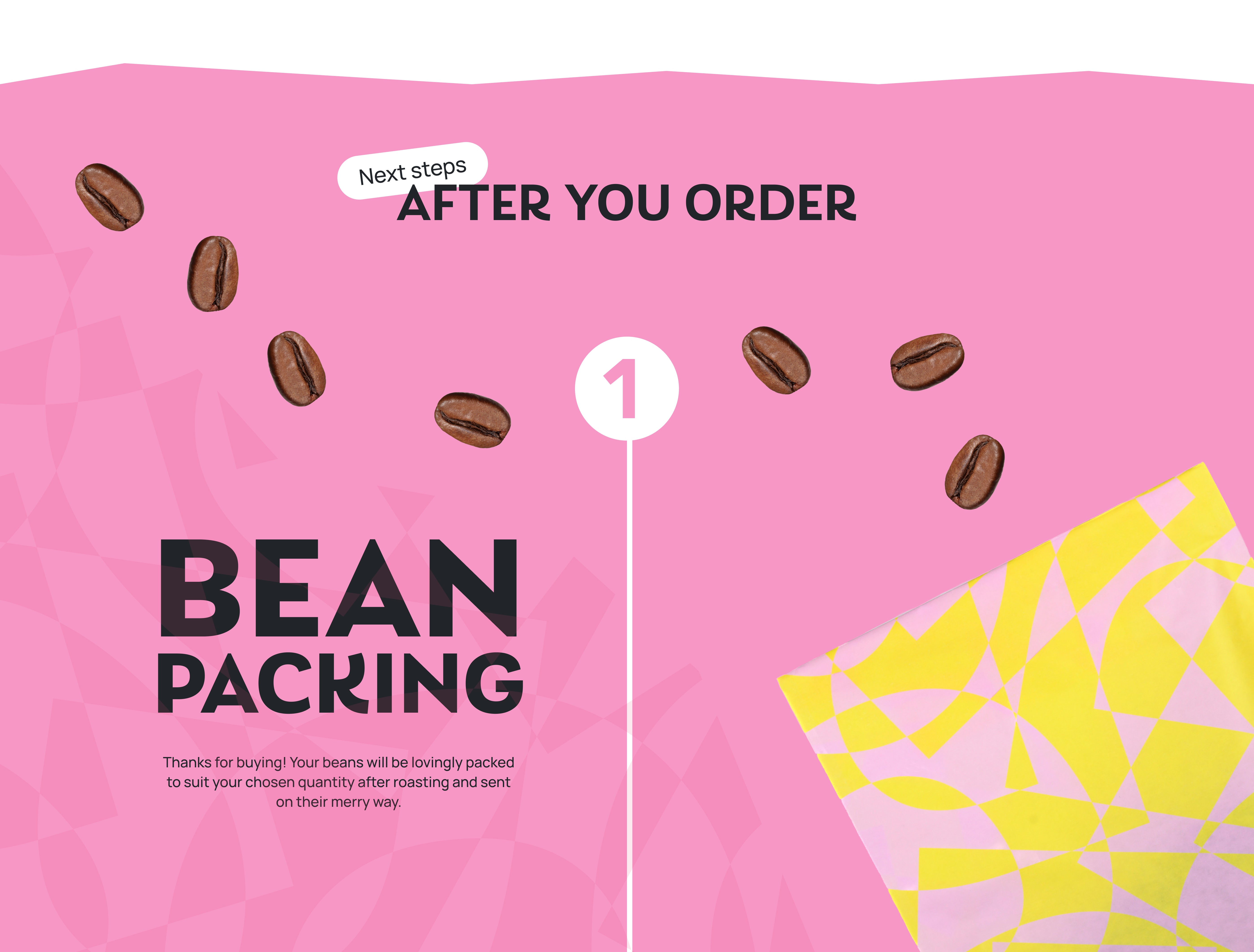 Next steps after your order 1.Bean packing. Thanks for buying! Your beans will be lovingly packed to suit your chosen quantity after roasting and sent on its merry way.